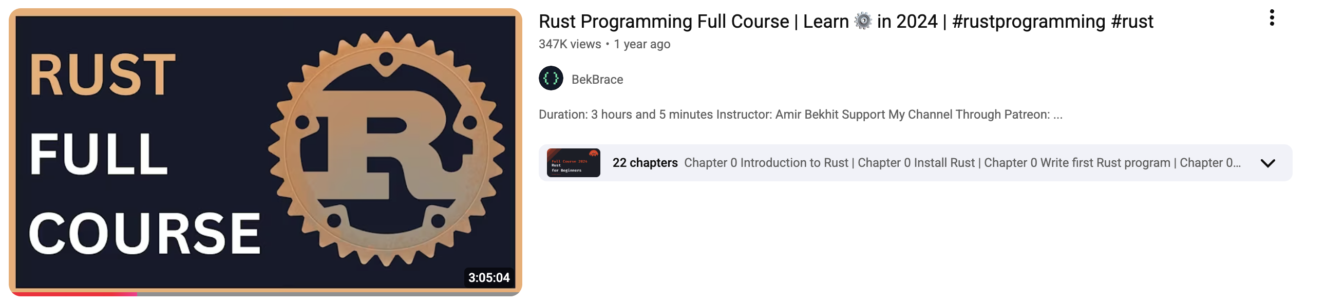 The course i went whit was about the first that comes on Youtube after searching "Rust course" 😅 It is from BekBrace on Youtube and really nice!